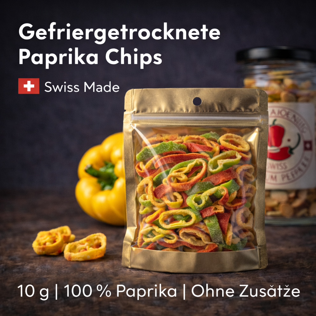 Unsere hausgemachten, gefriergetrockneten Paprika Chips werden aus vollreifen, aromatischen Schweizer Paprikas hergestellt. Durch die schonende Gefriertrocknung bleibt der reine, natürliche Paprikageschmack vollständig erhalten – intensiv, fruchtig und angenehm süss.